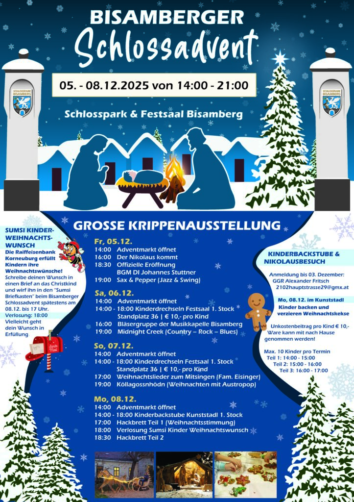 Von 5. bis 8. Dezember 2025, jeweils von 14 bis 21 Uhr, lädt die Marktgemeinde Bisamberg zum vierten Bisamberger Schlossadvent. Besucherinnen und Besucher erwartet ein stimmungsvoller Adventmarkt mit 36 Ausstellern, Kinderbackstube, Kinderdrechseln und einer traditionellen Krippenausstellung. Auch heuer prägt der Bisamberger Holzbildhauer Andreas Mathes maßgeblich die weihnachtliche Atmosphäre im Schlosspark.